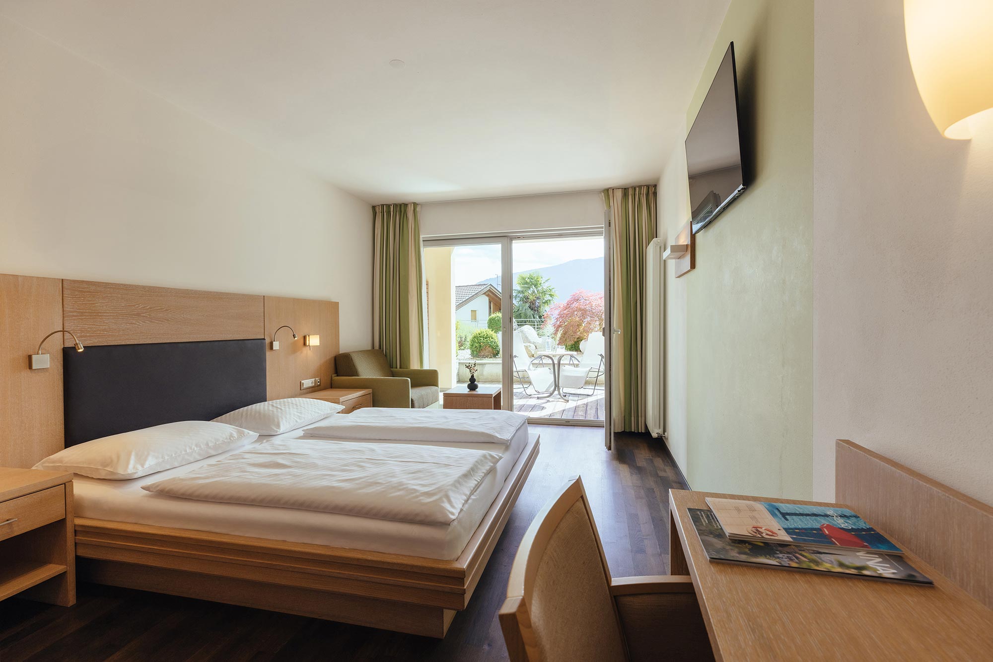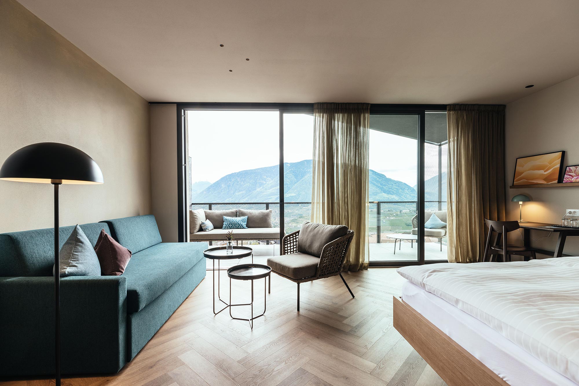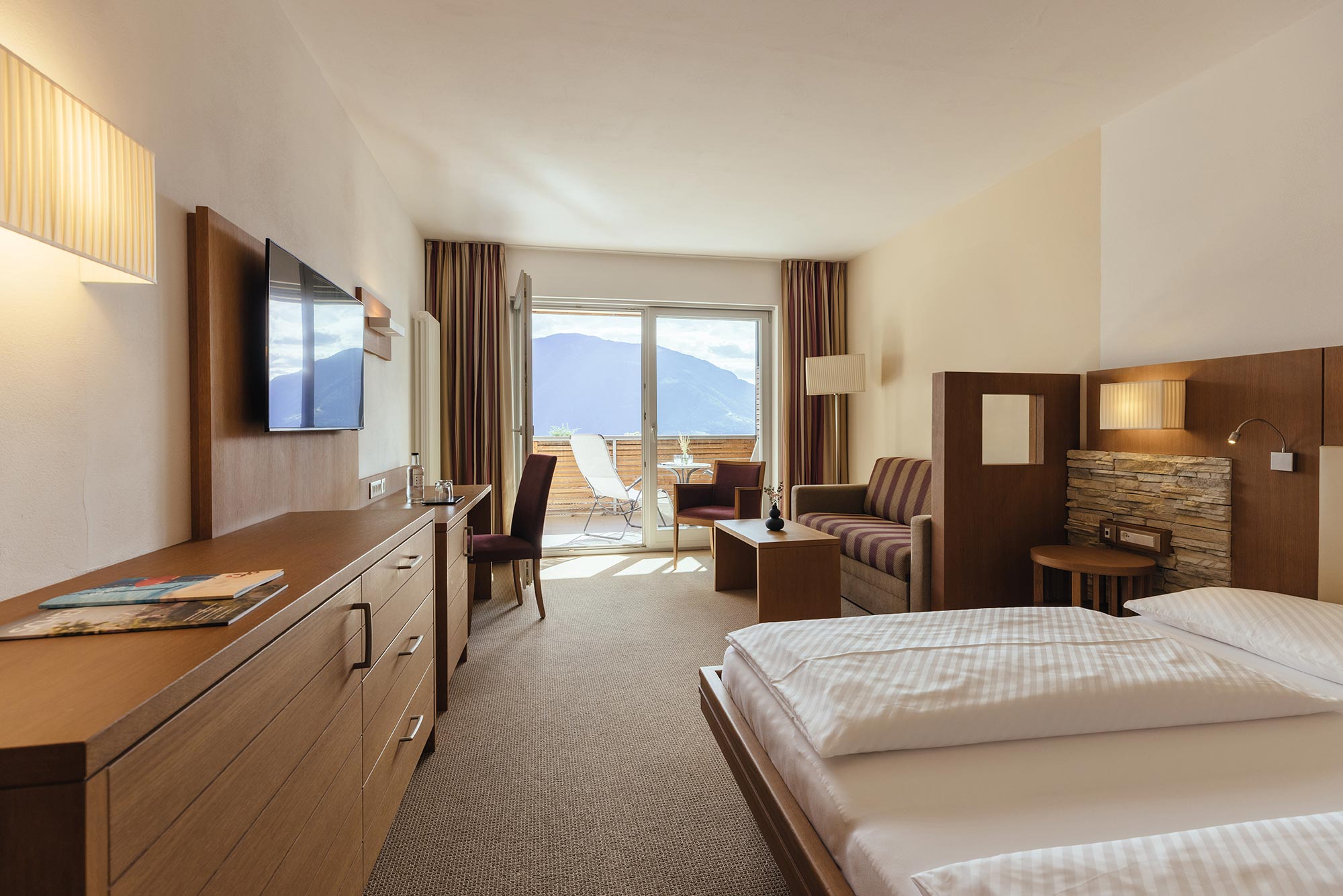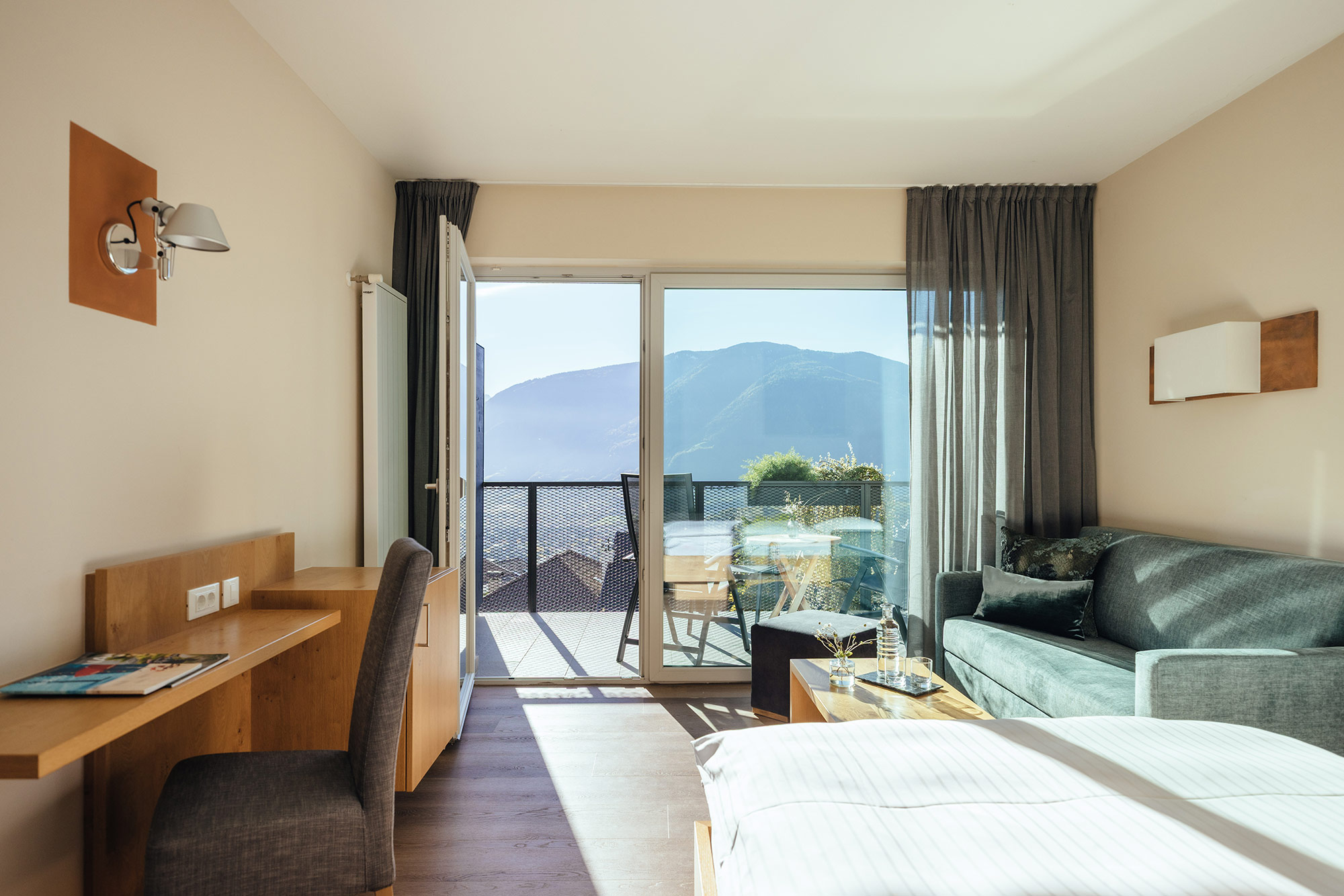 Unser Wellnesshotel hat nur 43 Zimmer. Deshalb fühlt sich das Wohnen hier eine Spur privater und persönlicher an. Der Einrichtungsstil ist zeitgemäß, die Atmosphäre gemütlich. Viel Licht, heimisches Holz und warme Farben. Die allermeisten Zimmer lenken den ersten Blick beim Aufwachen in die Berge und auf das Meranerland. Da bleibt einem fast nichts anderes übrig, als – hopp hopp – das kuschelige Nest zu verlassen und herrlich ausgeschlafen in einen neuen Urlaubstag zu starten… los geht’s!