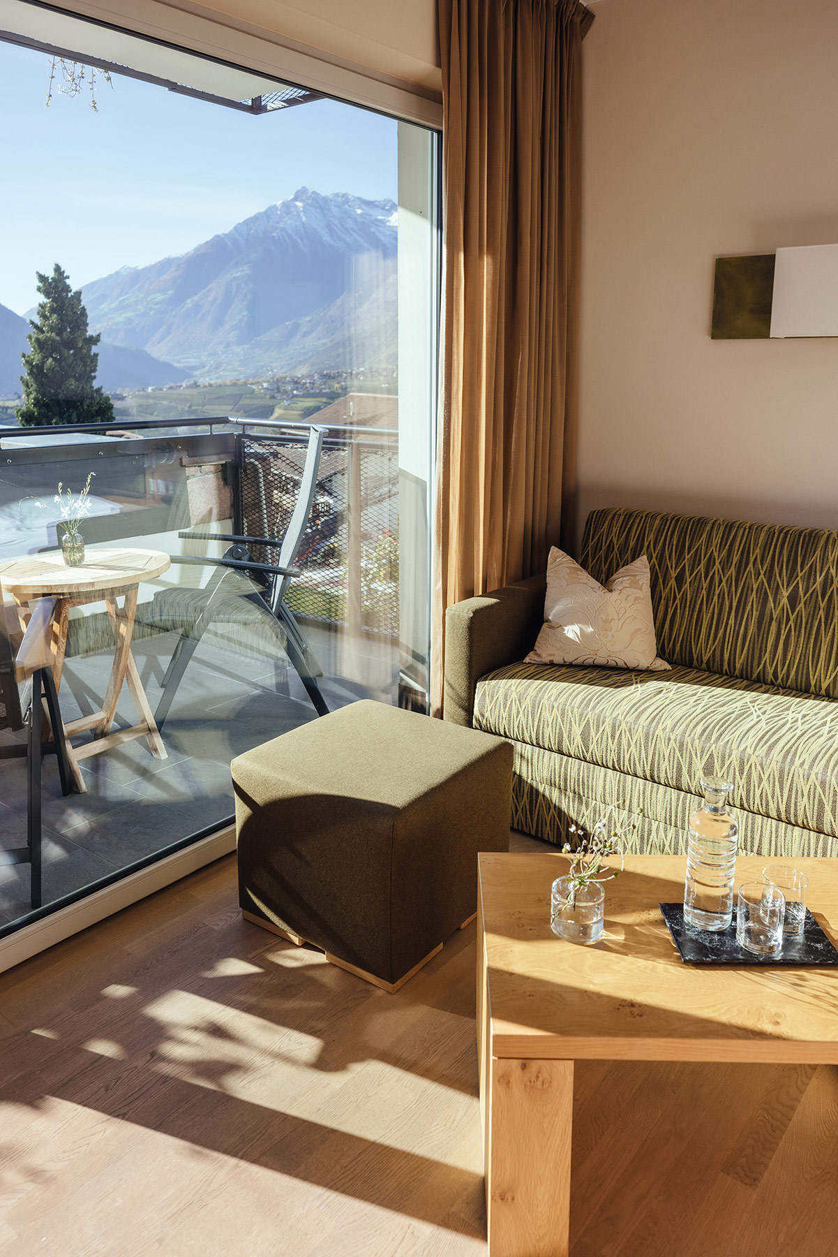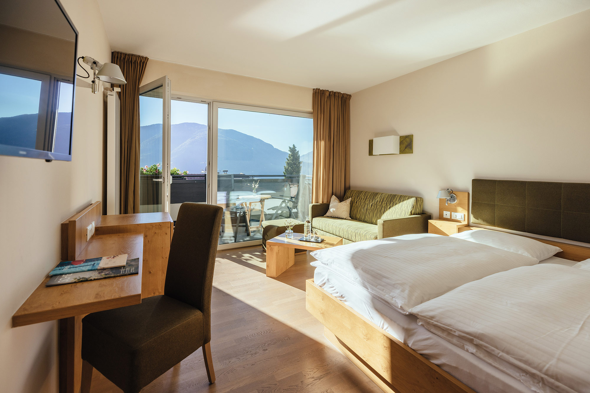 Mit Südbalkon und Panoramablick auf das Meraner Land, Holzboden, Dusche/WC, Bidet, Kühlbox, Sitzecke, Nichtraucherzimmer, TV, kostenloses W-LAN, Klimaanlage.