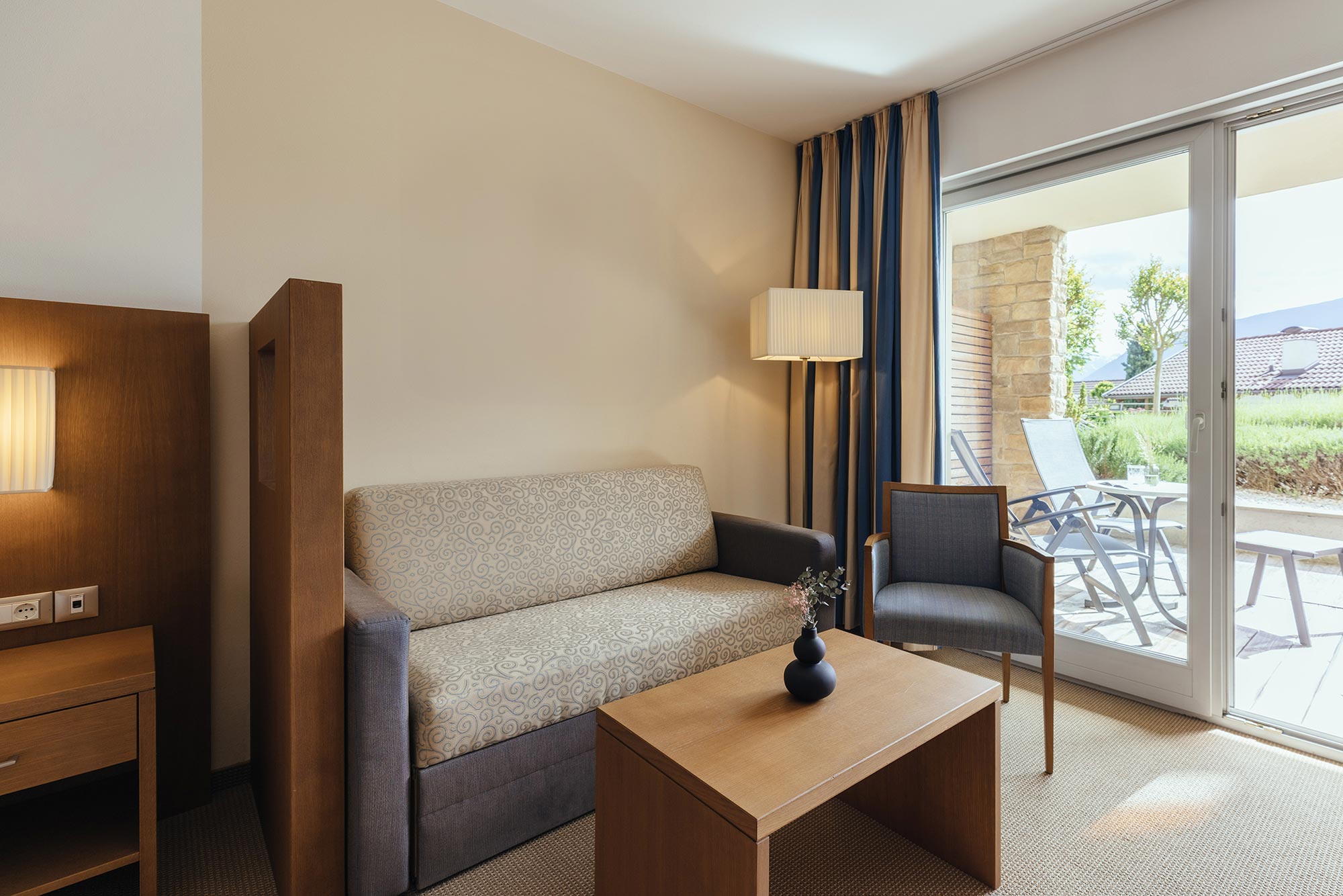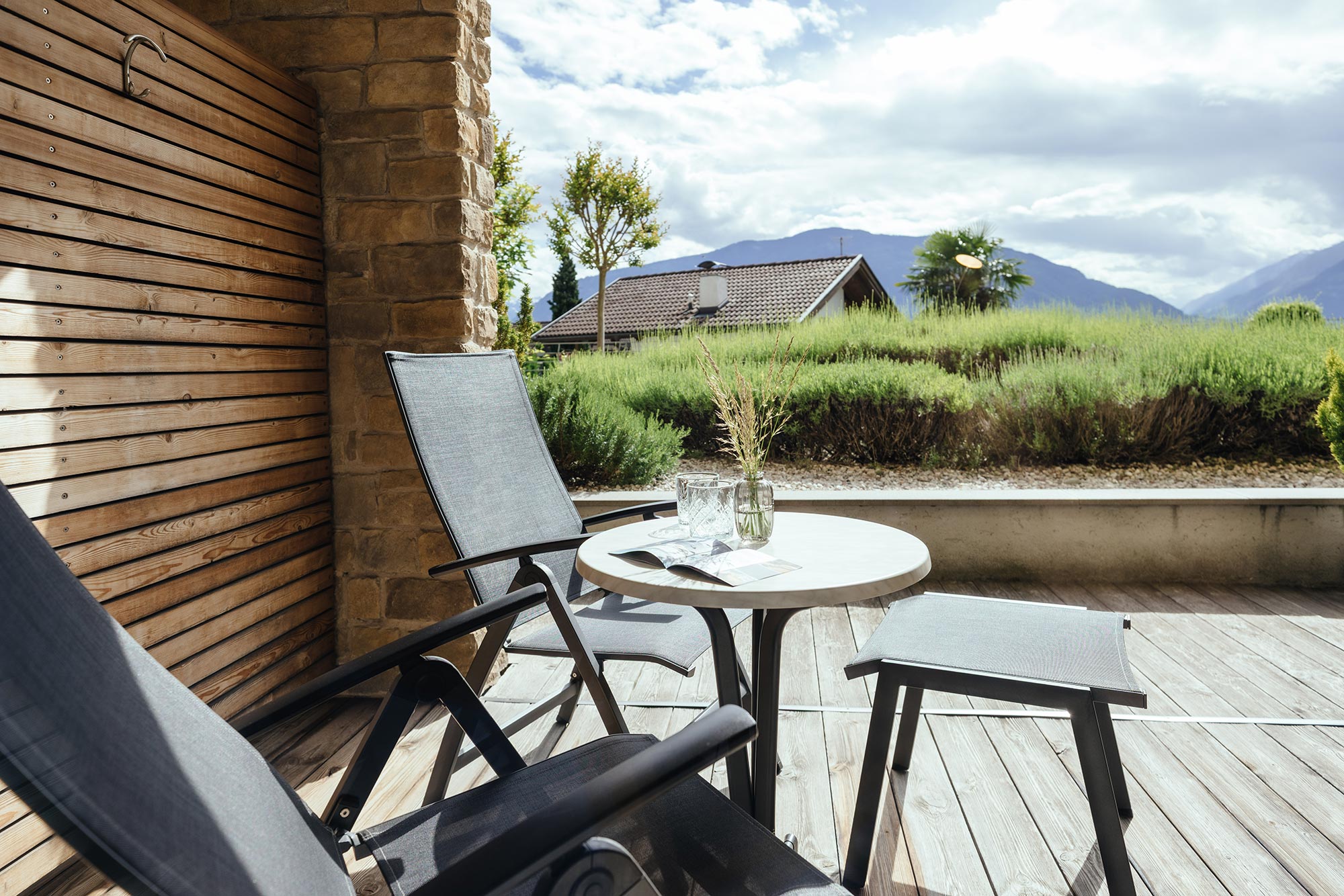 Mit Südbalkon und Panoramablick auf das Meraner Land, Holzboden, Dusche/WC, Bidet, Kühlbox, Sitzecke, Nichtraucherzimmer, TV, kostenloses W-LAN, Klimaanlage.