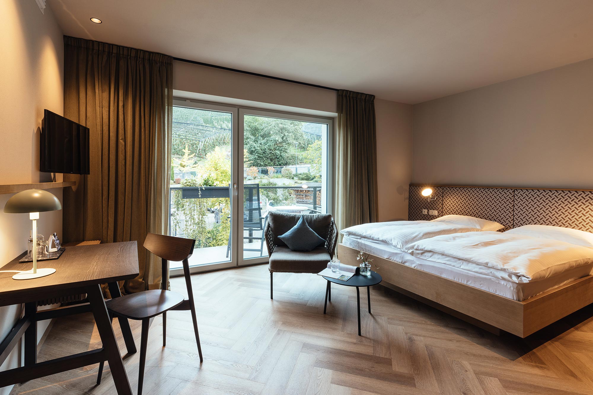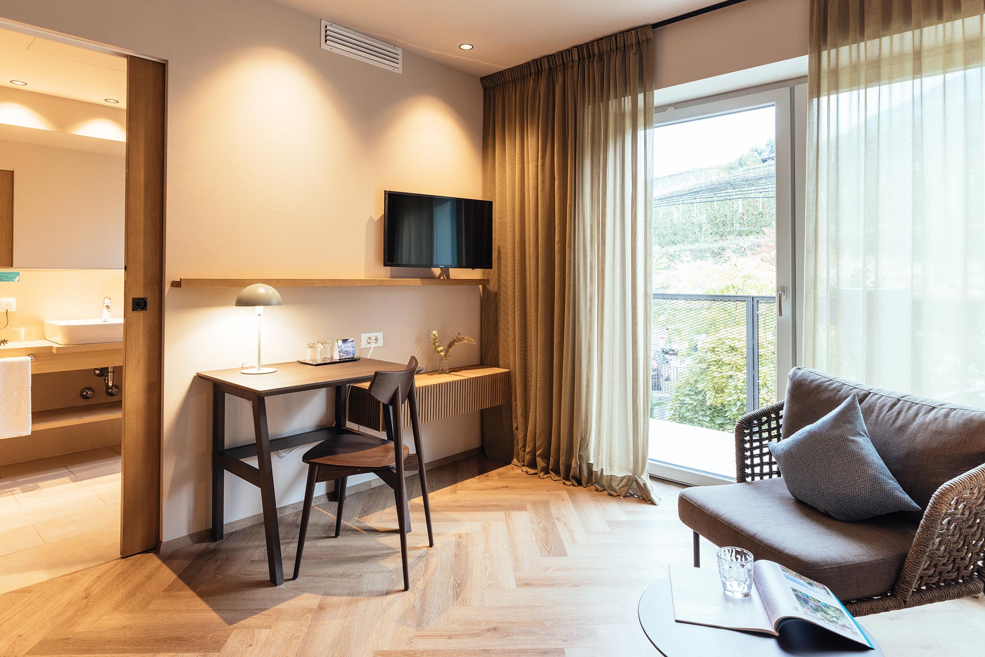 Mit Südbalkon und Panoramablick auf das Meraner Land, Holzboden, Dusche/WC, Bidet, Kühlbox, Sitzecke, Nichtraucherzimmer, TV, kostenloses W-LAN, Klimaanlage.