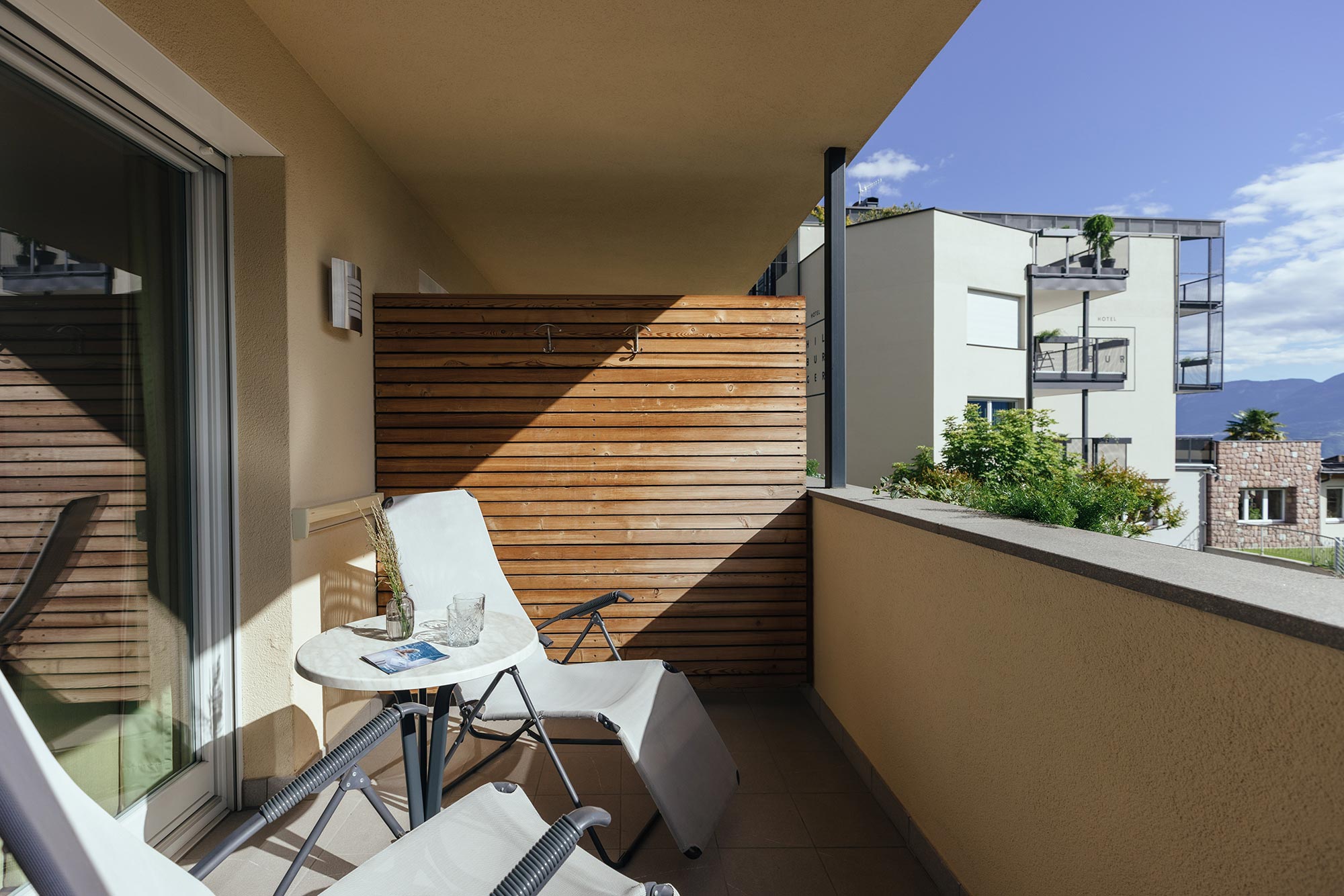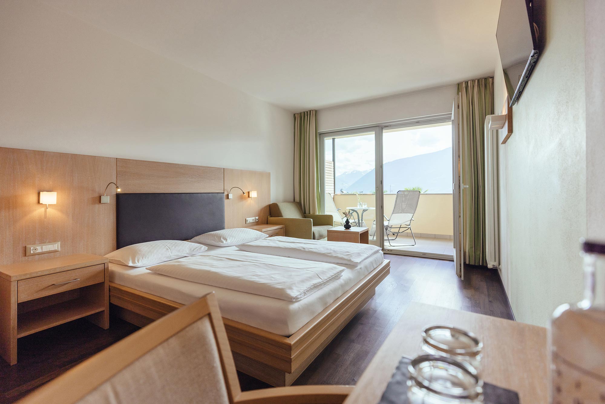 Mit Südbalkon und Panoramablick auf das Meraner Land, Holzboden, Dusche/WC, Bidet, Kühlbox, Sitzecke, Nichtraucherzimmer, TV, kostenloses W-LAN, Klimaanlage.