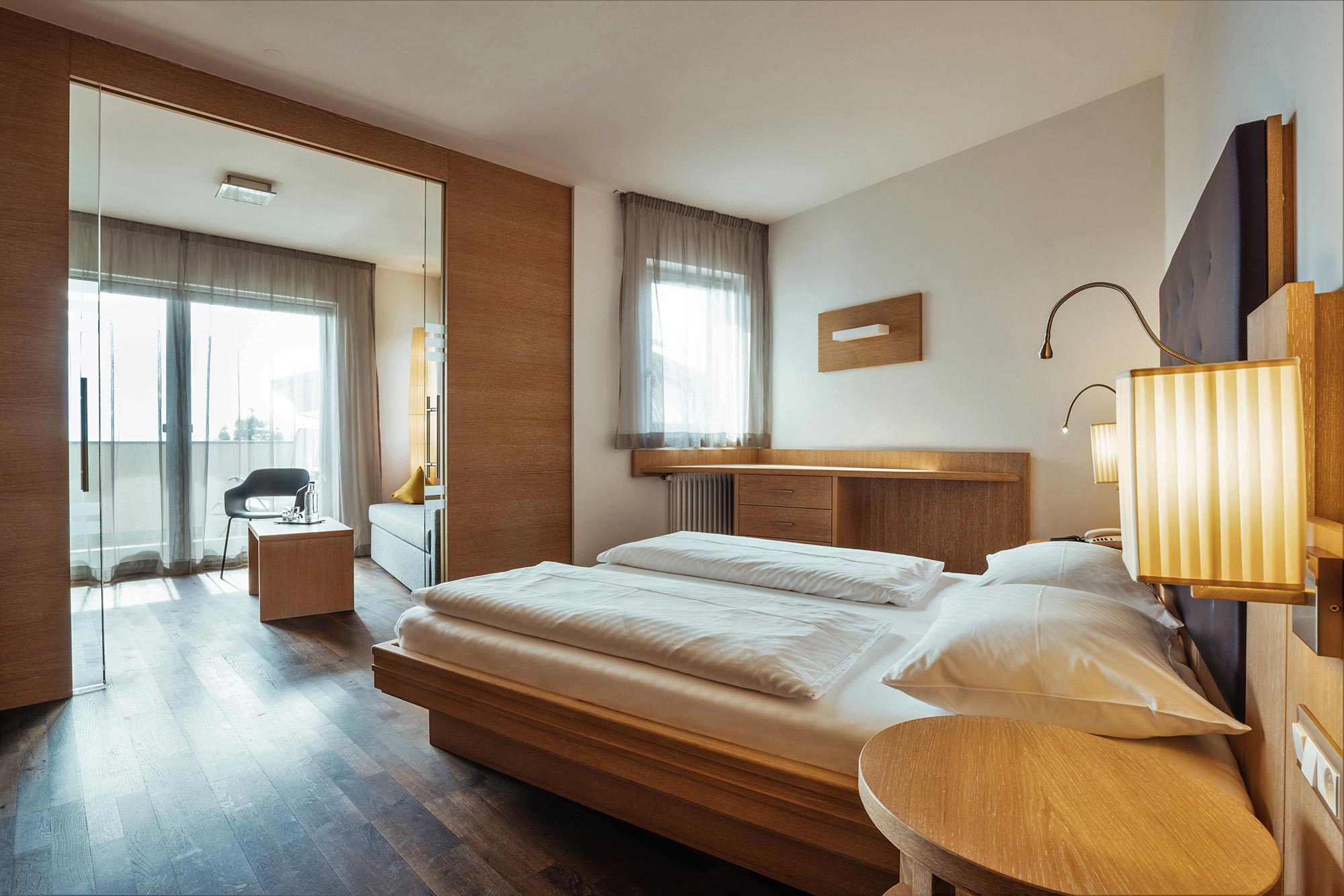Mit Südbalkon oder Terrasse, Badewanne und Dusche/WC, Sitzecke, Kühlbox, kostenloser Stellplatz in der Tiefgarage, Glas-Schiebetür zwischen Wohn- und Schlafbereich, Holzboden, Nichtraucherzimmer, TV, kostenloses W-LAN.